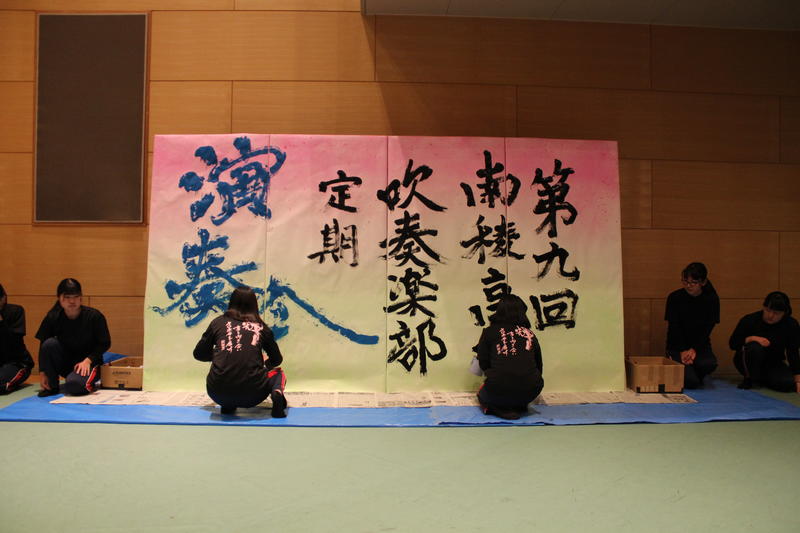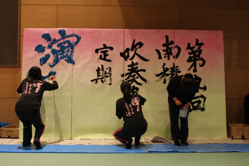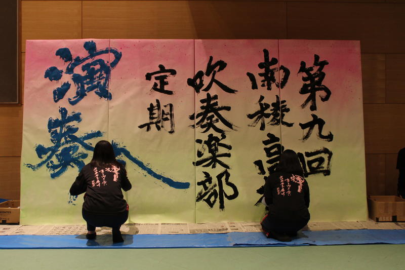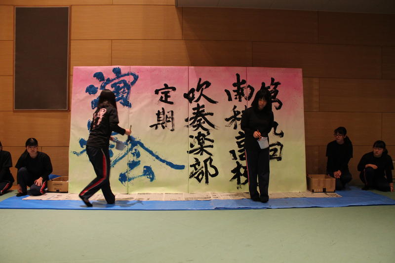 吹奏楽部定期演奏会では吹奏楽部の軽快な音楽に合わせて筆を走らせていきます。部員同士でアップテンポな曲に合わせて、書き始めるタイミングを確認したりと曲を聴きながら一生懸命書きすすめていました。
