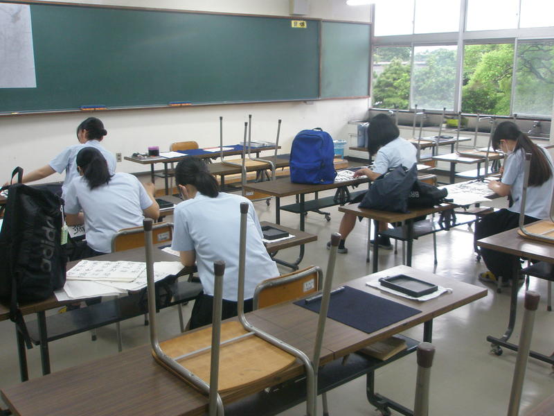 書道部は夏休み中も書技の向上にむけて日々練習に励んでいます。現在は、9月7日(土)に開催される第25回熊本県高等学校揮毫大会に向けての練習に取り組んでいます。書道教室にエアコンはなく、扇風機をフル稼働させて作品制作にいそしんでいます。