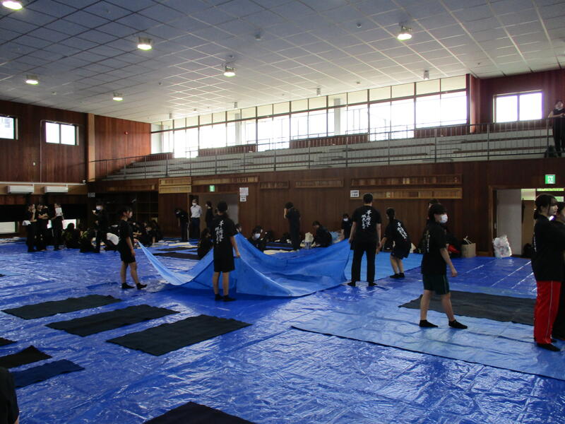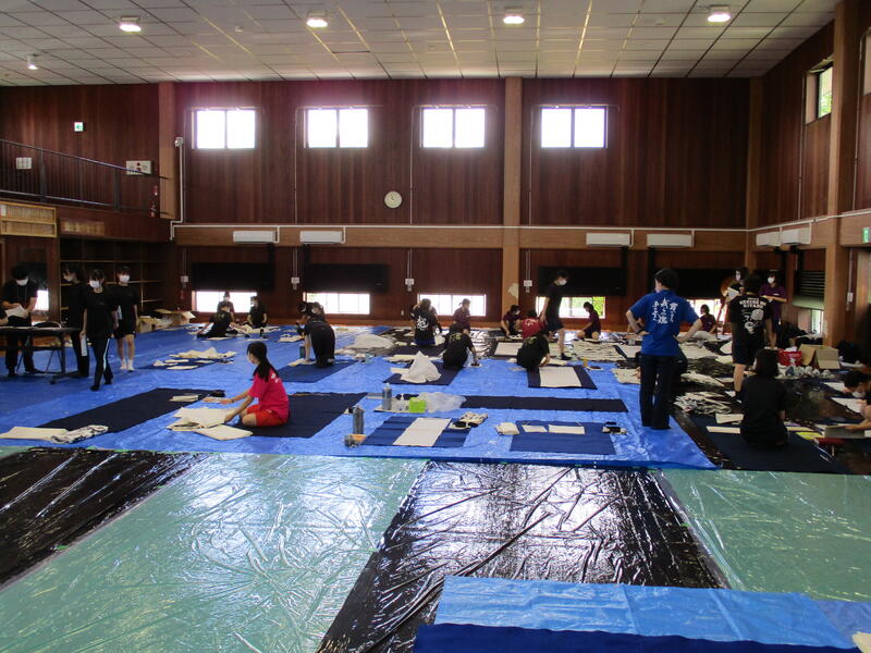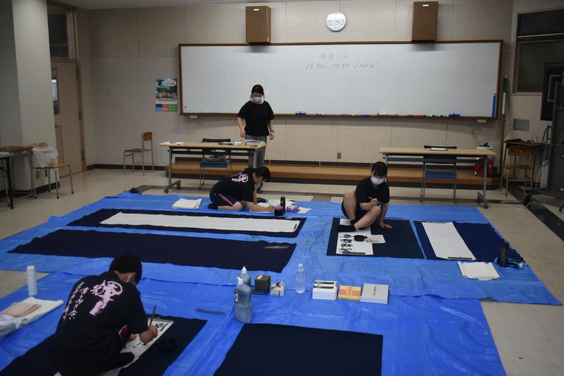 9月28日(土)に開催される体育大会の中で、午後の最初に行われる競技「部活動対抗リレー」のパフォーマンス部門に出場します。この数年書道部でこの競技に出場したことがなく、本番はどのようなパフォーマンスをするのかを考えるところからのスタートでした。部員一同前日まで体育大会の練習後の疲れている中でも練習を重ねました。この日も遅くまで本番をイメージしながらの練習に取組んでいます。