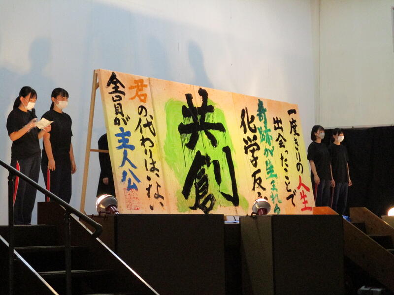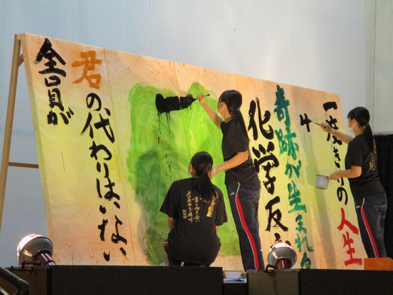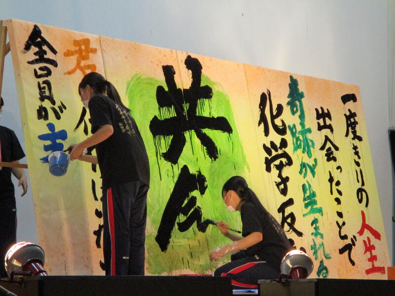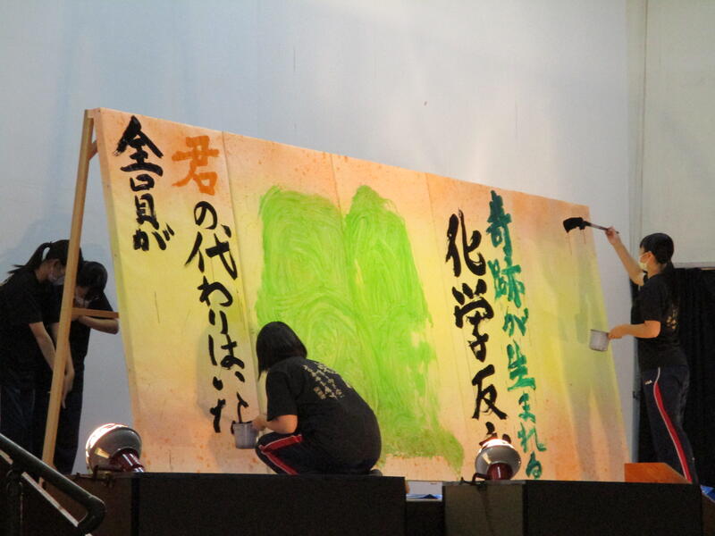 そして幕が開いたステージでスポットライトと観客の視線がステージ上に注がれ緊張も最高潮に達したなかで、「Official髭男dism」の「宿命」が流されると書道部員も代わるがわる曲に合わせてボードに貼り付けられたカラフルな用紙に揮毫していきました。今年度は部員自らが南稜祭のテーマである「Memory~青春の一ページ~」から考え出した思いを文章にしたものを揮毫していき、一心不乱に筆を動かして作品を完成させていました。体育館内からも大きな拍手や盛り上がりが見られ、無事に練習どおりのパフォーマンスをごらんに入れることができました。