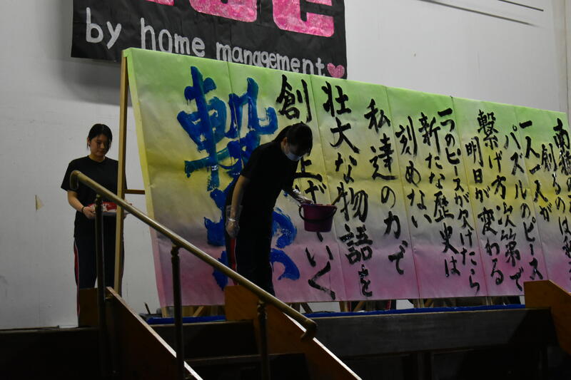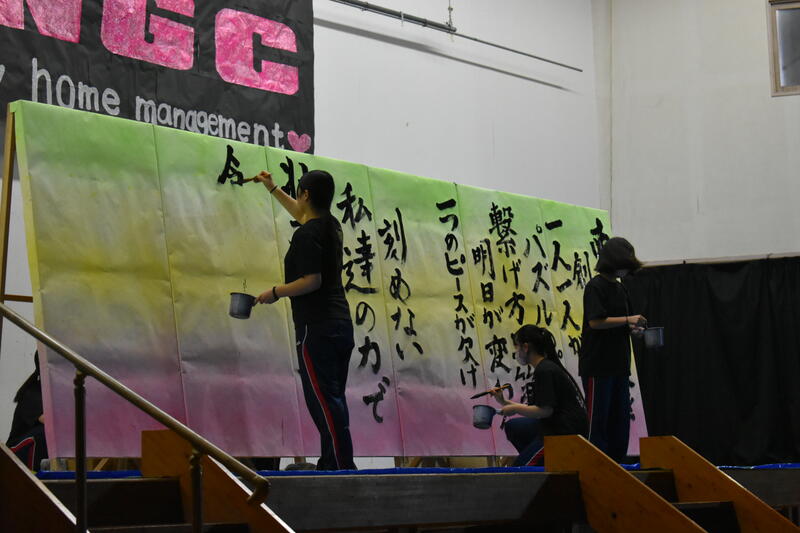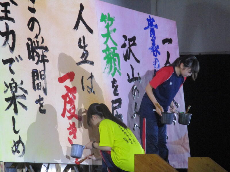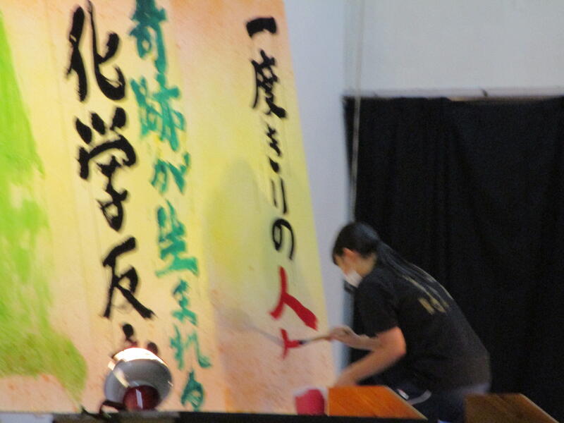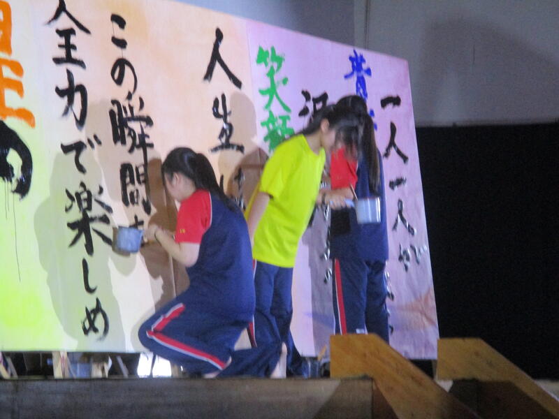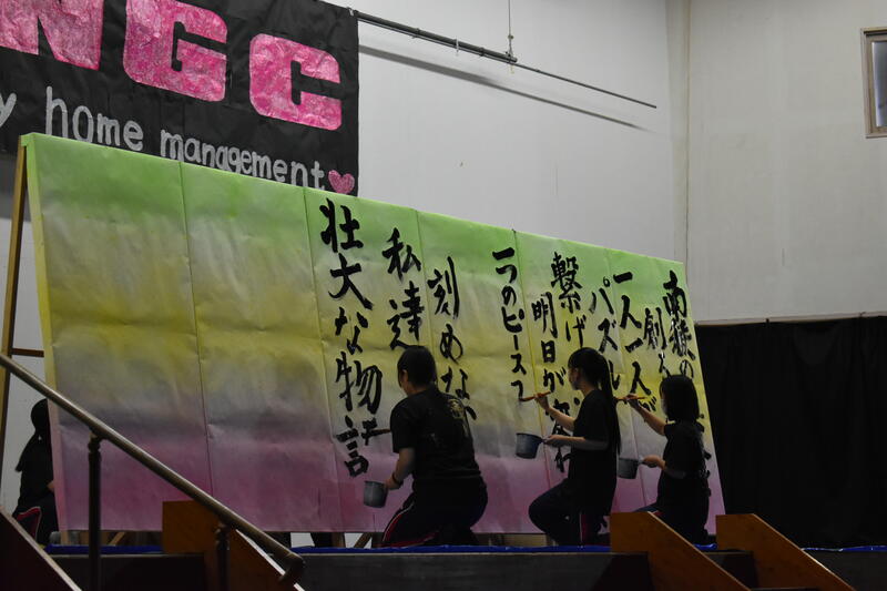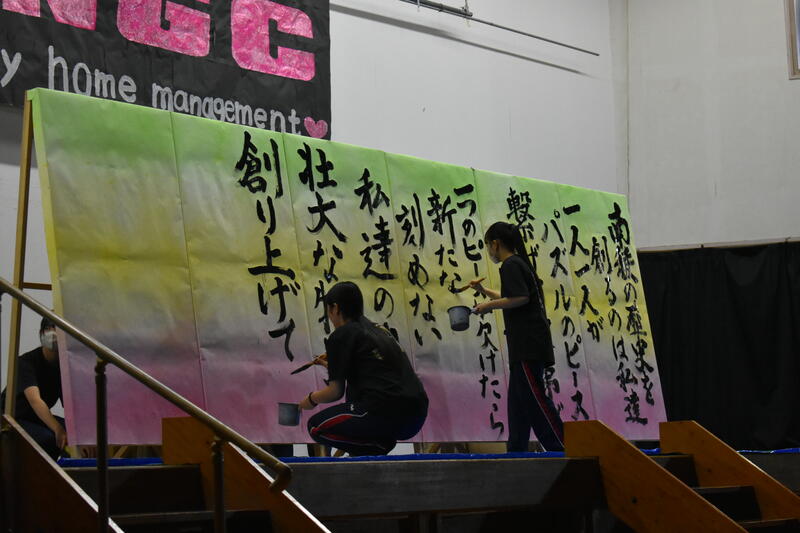 そして書道部員が代わるがわる曲に合わせてボードに揮毫していきました。部員自らが今年度南稜祭のテーマである「青春のパズル~一人ひとりの思い出のピースを繋げろ~」から考え出した思いを文章にしたものを揮毫していき、一心不乱に筆を動かして作品を完成させていました。