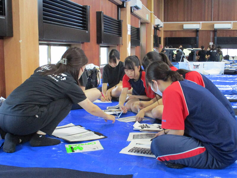 本校書道部員もこの日のために、この夏休みを中心に8月の作品制作講習会での練習成果を通して、大会前日まで精一杯練習を重ねてきました。そして、揮毫開始直前まで顧問の土肥先生の指導を受けて筆を運んでいました。また、この日を迎えるにあたり作成し、完成したばかりの書道部Tシャツ(「『輝』 書と向き合い その原石を磨け 南稜魂」)を身にまとい、気持ちを一つに高めていきます。