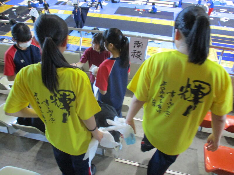 本校書道部員もこの日のために、この夏休みを中心に8月の作品制作講習会での練習成果を通して、大会前日まで精一杯練習を重ね、顧問の土肥先生の指導を受けて筆を運んでいました。そして、書道部Tシャツ(「『輝』 書と向き合い その原石を磨け 南稜魂」)を身にまとい、気持ちを一つに高めていきます。