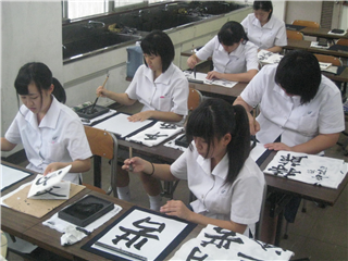 書道部は平成28年11月現在、3年生が引退して1年生女子6名で活動をおこなっています。活動日は月・水・金の週3日を基本に2時間、書技の向上に励んでいます。出品展だけに限らず、県下の書道部員が集まる生徒錬成会や、検定試験、そして高校の書道部員が一同に会し、その場で作品を制作して書技を競う「揮毫大会」にも参加しています。さらに文化祭での音楽部とのコラボレーションによるステージパフォーマンスなどにも参加し、部員皆が精力的に活動に励んでいます。部員は楽しく書道とふれあっており、日々お互いに高め合って頑張っています。