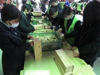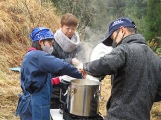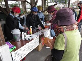 休憩時間には「球磨川ツクシイバラの会」からぜんざいやお茶、温州みかんや漬け物、あめ玉等が振る舞われました。紙コップにぜんざいやお茶をついだり、参加者の皆さんにお茶やみかん、漬け物を配ったりと、いろいろな手伝いをさせていただきました。