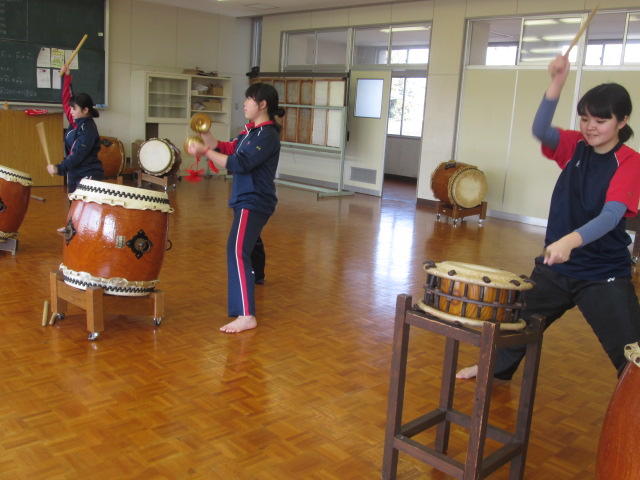 3月8日(金)太鼓部の練習風景です。新3年生1人、2年生2人の3人で頑張っています。3月17日(日)に行われます、「南稜マルシェ」で演奏します。