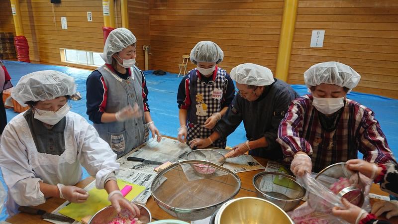 ひとよし温泉春風マラソンの参加者にふるまう人吉球磨の伝統料理「つぼん汁」の材料を切るボランティアに生活経営科の2人が参加しました喜ぶ・デレ