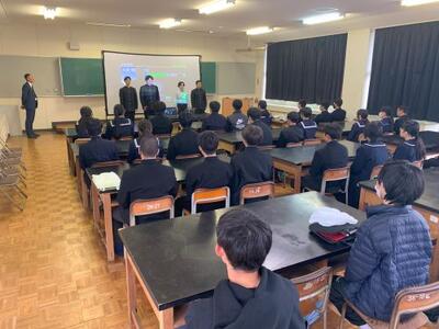 熊本県職員の方々を招いて、環境コース2年生と、環境コースに行く予定の1年生対象に熊本県林業職の説明会がありました。熊本県の森林・林業の状況と林業職とはどのような仕事なのかを教えていただきました。