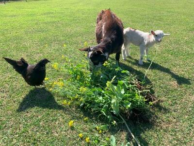 農場内に生えている菜の花を小動物舎に持っていくと、ヤギの親子やニワトリが美味しそうに食べていました。