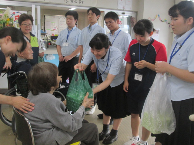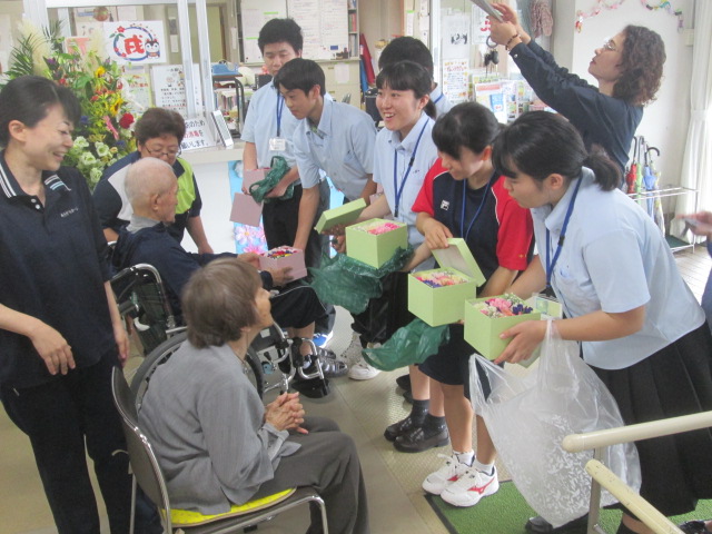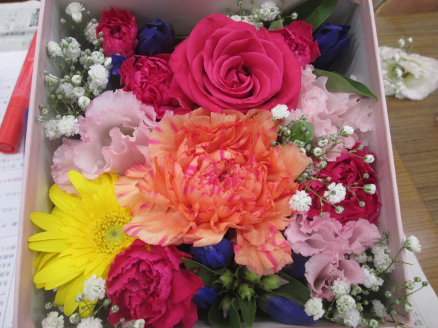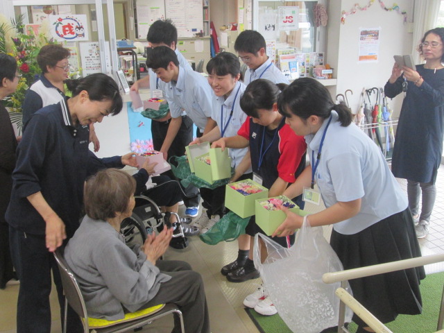熊本県花き協会から立岡淳子さん(国家検定一級技能士)ら2人が来校。5限目にフラワーBOXを作り、6限目に日頃お世話になっている施設にBOXを贈呈しました。写真は、あさぎりホームへ贈呈に行きました。