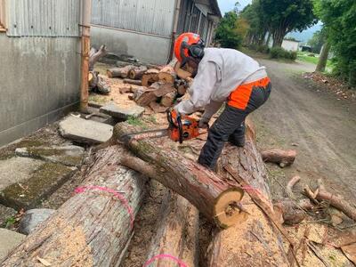 イトヒバは赤身のある綺麗な木目をしているので、最初は、製材する予定でしたが、伐採してみると全部、芯が朽ちていました。そのため、短く切って、薪にするのです。さすがは、3年生です。安全に操作をしていました。