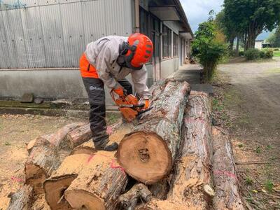 3年生の環境コース林業専攻は、2年生の時にチェーンソーの資格を取っているので、最初からチェーンソーを使った実習をしました。これはイトヒバという木で校内に生えていた樹木です。