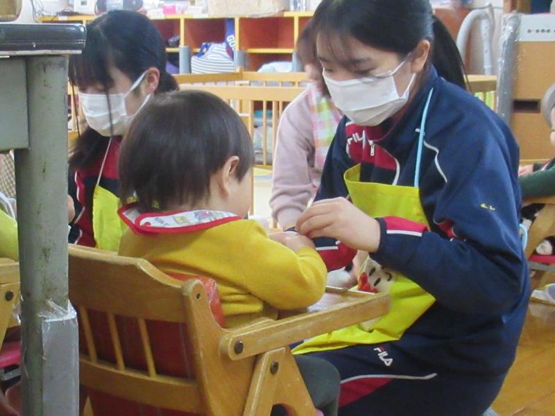 初めて未満児クラスに入ったときは、スプーンで口までご飯を運ぶのも難しいことでしたが、生徒たちも慣れてきて、子ども達に「おいしい?」「スプーンの持つ手はこっちだよ」などと声かけをしていました。