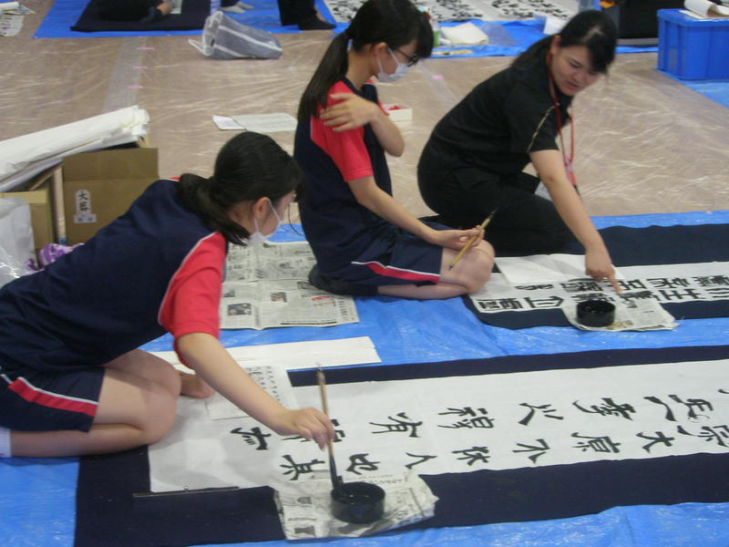 開会式終了後、揮毫開始です。制限時間2時間のうちに作品を仕上げなければならないとあって、会場内に書道部員の緊張が伝わってくる独特の雰囲気の中で作品に取り組んでいました。