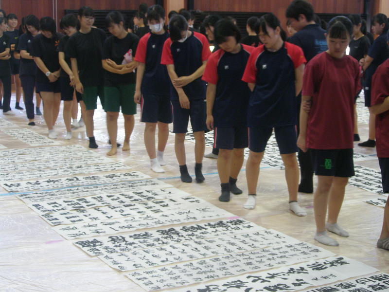 8月7日(水)に宇土市武道場で開催された熊本県高等学校書道「作品制作講習会」に南稜高校書道部員6名が参加しました。この日は県下高校の書道部員99名が揃い、武道場の中は書技の向上に取組もうとする熱気に包まれていました。