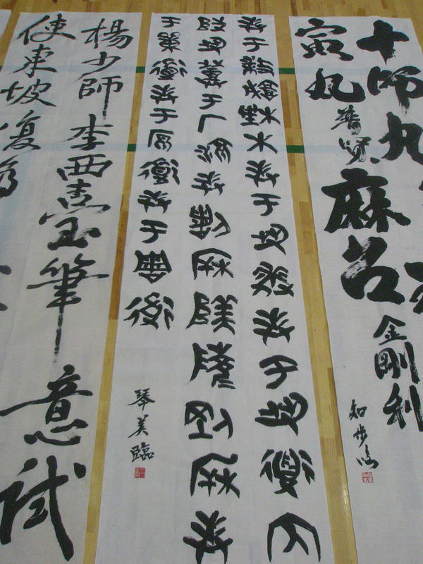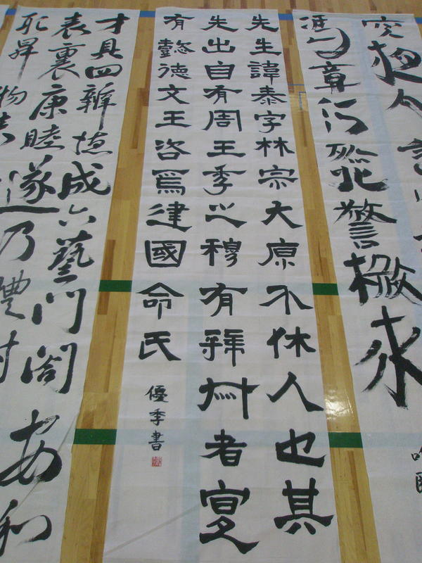 揮毫終了後、各学年・部門ごとにフロアに並べられ、参加者全員でそれぞれの作品を鑑賞しました。この中で本校書道部も全員力のこもった作品を作り上げることができました。日頃の練習の成果をこの2時間に込めた作品の数々が出そろいました。
