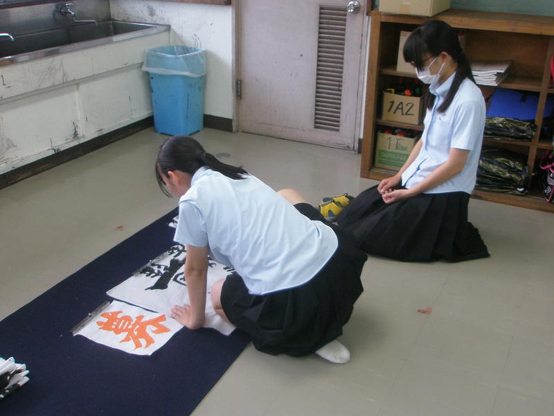 この「書道部募集中」の文字は、全校生徒へアピールできる機会が少ない中で、書道部員一同「是非書道部へ入部してください!」という気持ちを込めて書きました。しかし、当日はあいにく午後から雨の予報が出ており短縮プログラムで進行されました。残念ながら来校された皆様にグラウンドで御披露目できる機会がなく大変残念でした。