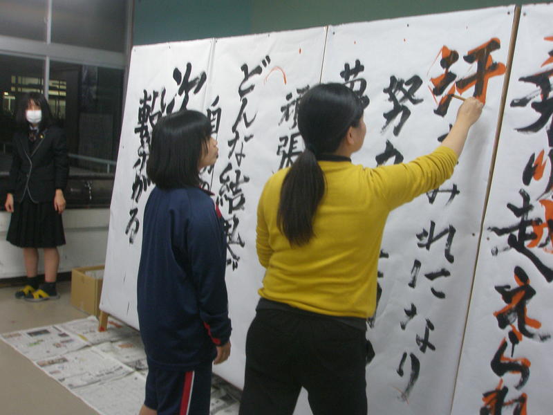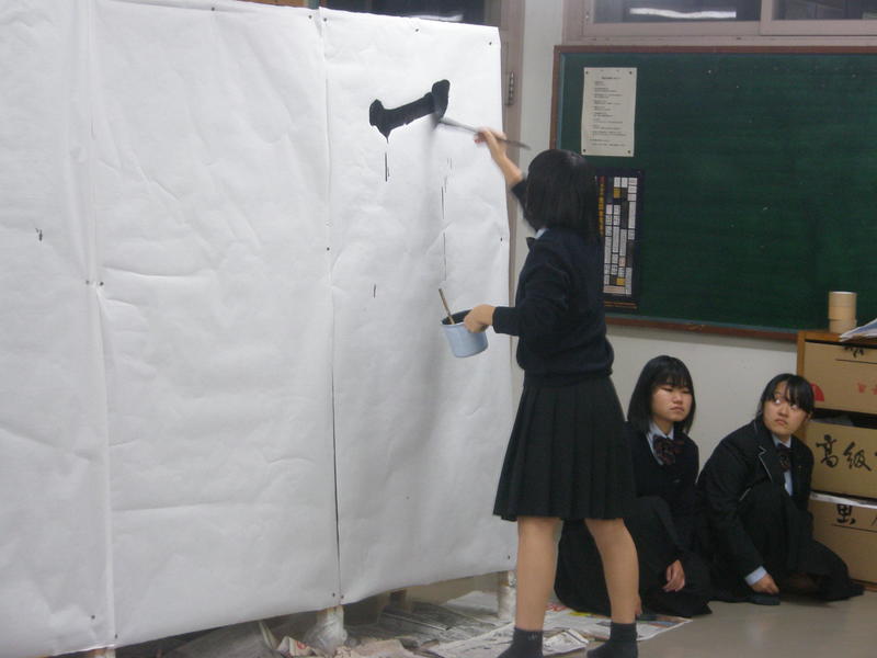 書道部員も代わるがわる曲に合わせてサビの部分の歌詞をボードに貼り付けられた用紙に揮毫していき、