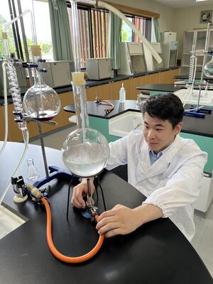 食品化学実験ではヨウ素デンプン反応実験を行い、醸造実験では、アルコール度測定を行いました