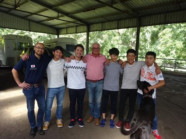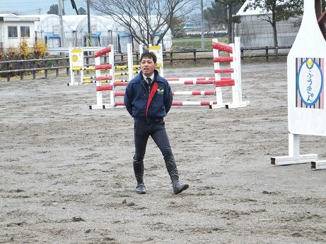 先週の日曜日、大津町在住の熊本県出身現翔陽高校卒業の宮崎栄喜氏をお迎えして、全国大会出場選手に対しての障害飛越競技と馬場馬術競技の練習を見ていただきました。