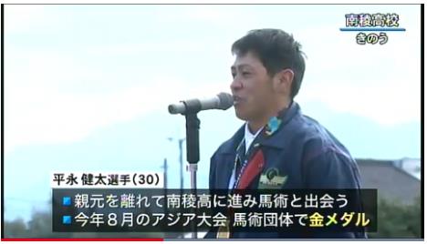 今年8月のアジア大会で金メダルを獲得した馬術の平永健太選手が、母校・南稜高校での大会に出場。平永選手は大阪府出身の30歳で、高校時代に、親元を離れて、南稜高校に進み、馬術と出会った。平永選手は、小学生から大人まで約120人が参加する親善チャリティー馬術大会で日本代表の赤い乗馬服を着て出場。鮮やかな手綱さばきを見せた