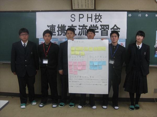 ・高鍋農業・福岡農業・南稜高校SPH校 3校連携 学習会 (2017/12/11) 投稿日時 : 2017/12/12 学校サイト管理者 ・宮崎県立高鍋農業高校・福岡県立福岡農業高校・南稜高校 SPH校 3校連携 交流学習会 (2017/12/11)12月11日(月)九州内の農業関係SPH校3校すべてが集まり、交流学習会を行いました。福岡農業高校 都市園芸科2年37人、高鍋農業高校 各科から34人、南稜高校 芸科学科2年野菜専攻 12人の合計83人が参加。福岡農業高校 泊校長先生の挨拶の後、各学校代表生徒挨拶。各学校の紹介プレゼンの後、12班に分かれて、交流学習会を行いました。学習テーマについて、協議し、まとめていきました。【学習テーマ】GAPのメリット・デメリットを理解し、必要性と導入に向けた課題を検討する学習①:GAPの共通理解を図るため、班内でGAP概要をまとめる【以降、KJ法で進行】学習②:GAP導入によるメリット(効果等)を考える学習③:GAP導入によるデメリットを考える学習④:まとめとして、GAP導入の必要性・課題を考える発 表:GAPについての学習成果をまとめ、代表班(3班)による検討結果の報告を行う福岡農業高校 泊校長 挨拶12班に分かれて 協議福岡農業高校の生徒の皆さん