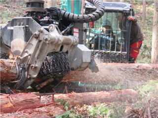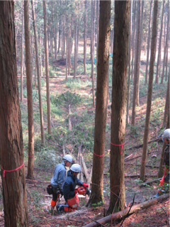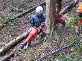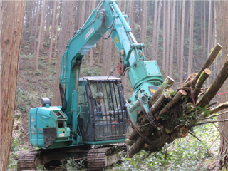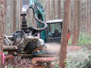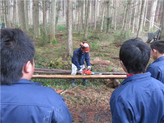 チェーンソーによる伐採作業を体験しました。また、林業機械(グラップル・プロセッサ)を使用し搬出・集積を行いました。