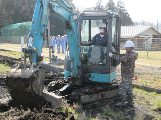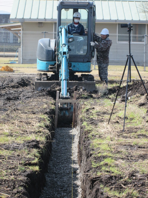 2月27日(月)に出前授業において、事前の学習(研修)しています。暗きょ排水の仕組みを実習を通して学び、機械で