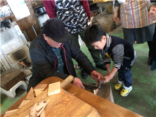 薪割りをして、釜でご飯を炊きます。 上昇気流を起こして、下の火の熱を釜に伝えます。