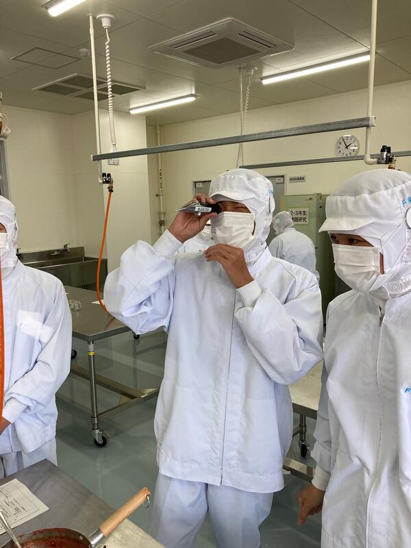 2先生は、火曜日と木曜日の5,6限目に食品製造実習班と食品化学実験班に分かれて授業を展開します。先日25日にいちごジャムを製造した班が本日食品化学を学び、25日に食品化学を学んだ班が本日いちごジャム製造実習を行います。食品科学科ではこのようにクラスを分割し少人数化する等、1つ1つの授業を手厚く行っています。