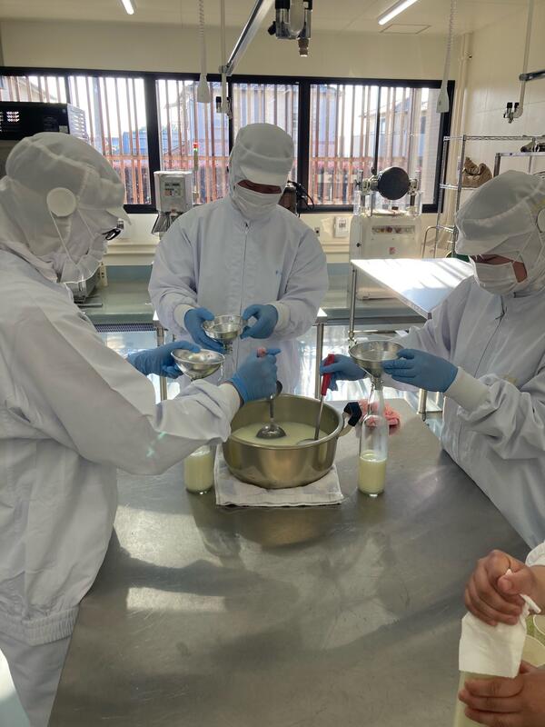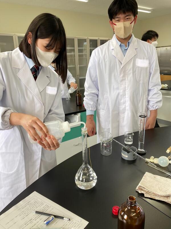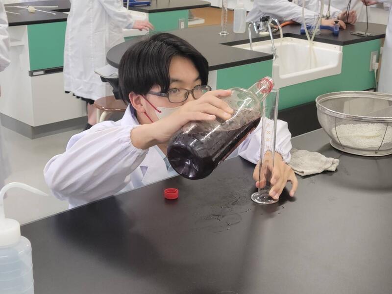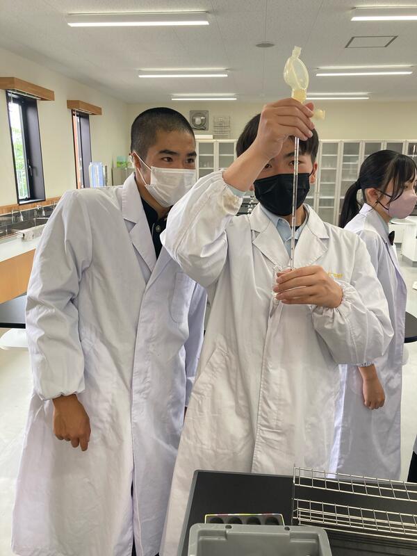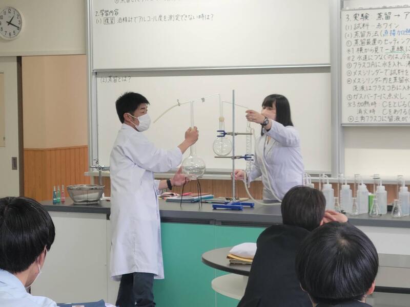 次に醸造です。醸造の実験に使う器具は大変高価であるため、注意を払って実験を行います。職員がはじめに使い方の説明をします。それに習って生徒たちも真剣に器具を扱い実験を行いました。