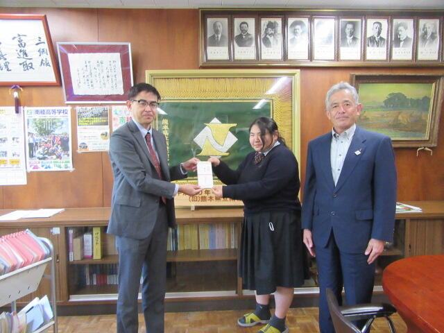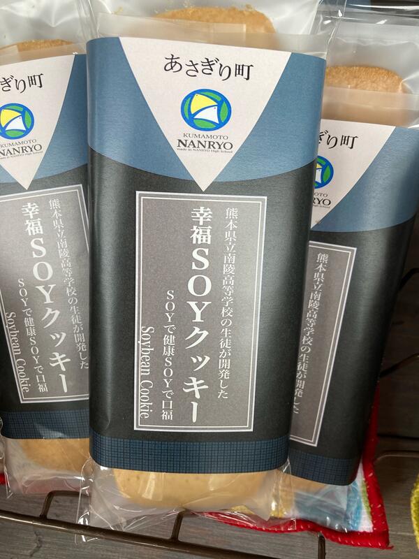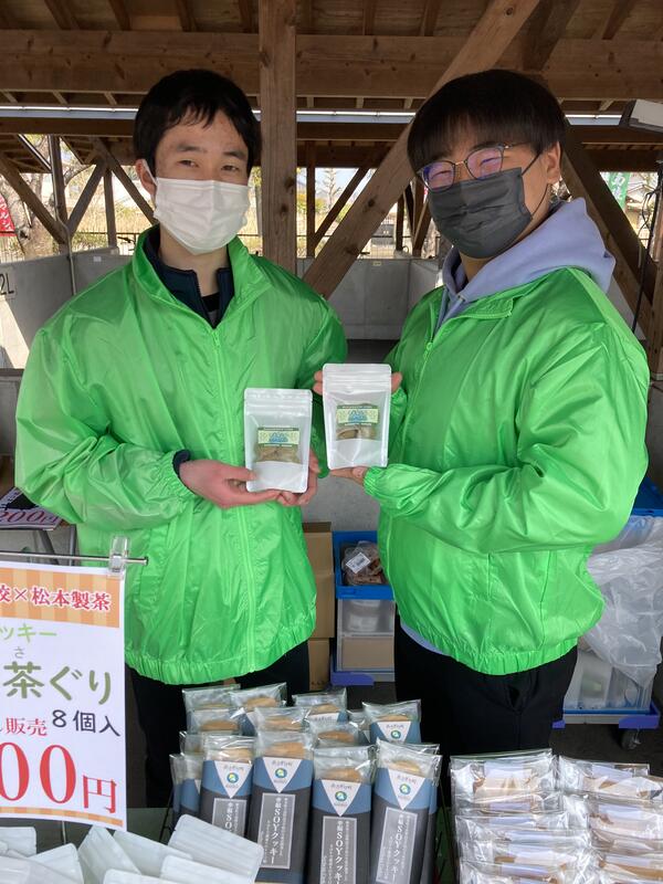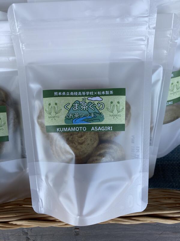 令和4年度卒業生が課題研究の授業で1年間をかけて開発した「くま茶(さ)ぐりクッキー」の販売が始まっています。改めて卒業生のこれまでの取り組みをご紹介します。南稜高校食品科学科では、以前より模擬会社を立ち上げ、新商品の開発を行ってきました。令和3年度には県南フードバレー推進協議会協力のもと、模擬会社HCC班が「フィナンシェ」の開発に携わりました。その先輩に続いて「私たちも人吉球磨を盛り上げたい」との熱い思いから、令和4年度模擬会社ASH班が誕生しました。模擬会社名の由来は「人吉球磨の特産品をアピールして、地元を盛り上げたい」という意味を込めてASH(Appeal the Special of Hitoyoshi kuma)と名付けました。模擬会社ASH班は、運営部(社長、副社長1名ずつ)、製造部3名、マーケティング部2名の合計7名で活動しました。生徒たちは、人吉球磨の特産品の中から「お茶」と「栗」の2種類に着目し、クッキー開発に取り組みました。地元の松本製茶や株式会社あさぎり・フレッシュフーズの協力を得ながら何度も試作を行いました。また、南稜祭のみならず令和4年10月に行われた球磨中央高校の中央百貨店で試食品を配布しアンケートを行うなど、各所の協力を得ながら精力的に活動しました。栗クッキーは完成に至らずでしたが、進路活動等に追われながらも最後まで根気強く取り組み、お茶クッキーを形にしました。令和5年2月に株式会社あさぎり商社へプレゼンテーションを行い、高校生の思いを汲んでいただき商品化することができました。開発、製造、販売に携わっていただいた皆様本当にありがとうございました。また卒業生の皆さん大変良く頑張りました。