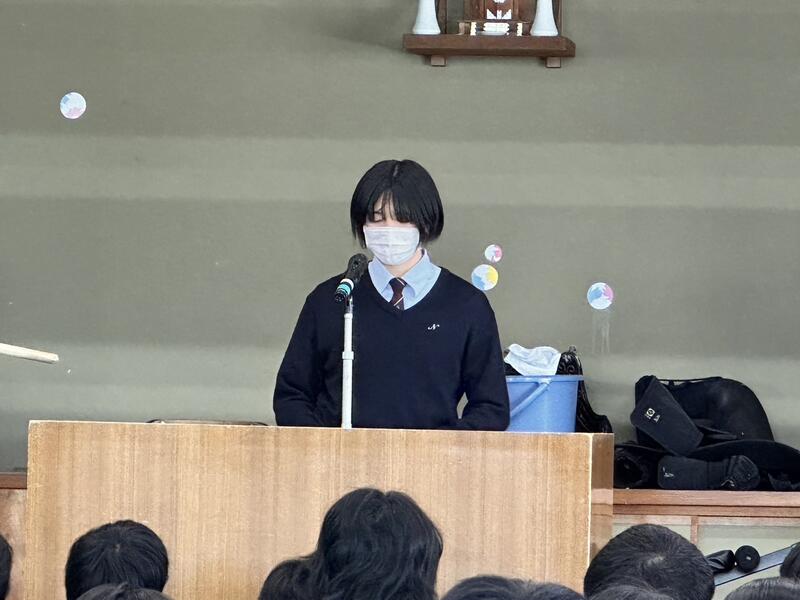 先頭バッターは一年生。内容もよかったですが、何より先輩の前で堂々と自身の考えを述べたことが素晴らしく思いました。1年生は3名の生徒が発表しましたが、感想は「今年の1年は違う」です。素晴らしい感性を持っています。その高い意識でこれからの高校生活に取り組めば、個性的でかつ誰もたどり着けないような成果を上げてくれる。そんな可能性を感じました。
