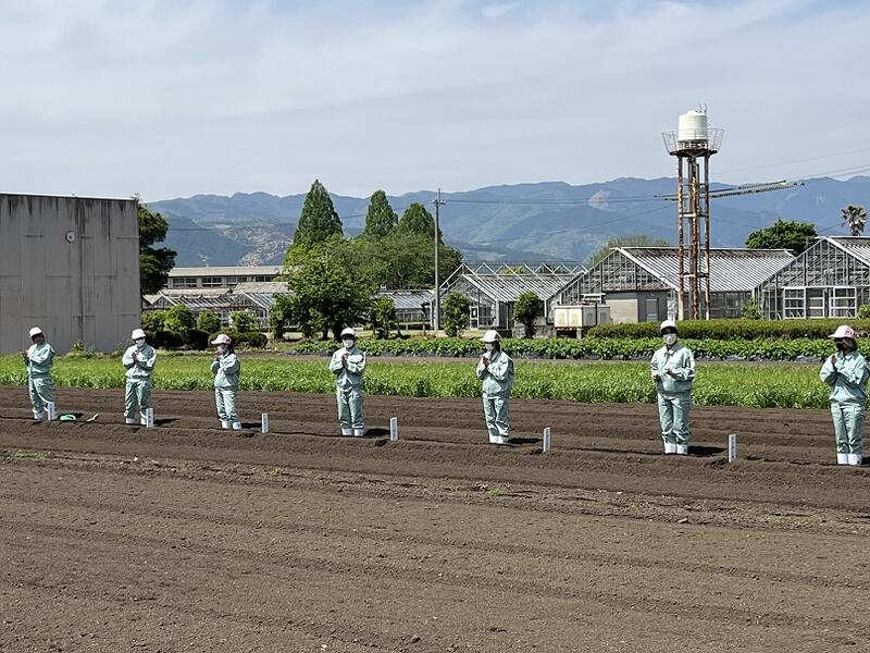 最後は全員で自分が植えた畝の前に立ちました。室長が「手を合わせてください」と言いました。「あ、いただきますじゃないねー。なんと言おうかー」とみんなと相談です。数秒相談した後、決定したようです。
