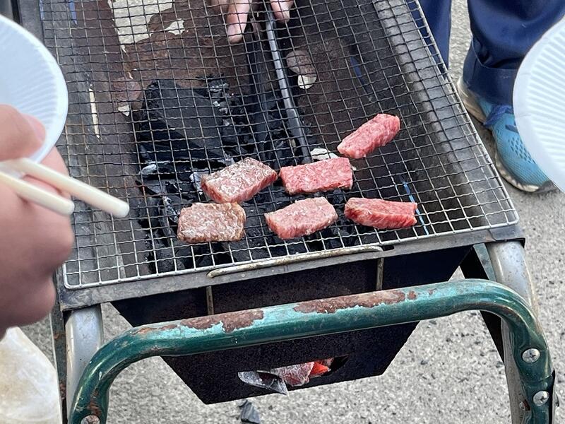 まずは、1月に出荷した黒毛和種「南稜姫」号の肉を食べます。南稜姫は格付けの最高峰、A5(BMS12)を獲得した牛肉です。しっかりと鼻から抜ける香りを感じながら頂きました。ありがとう、南稜姫。