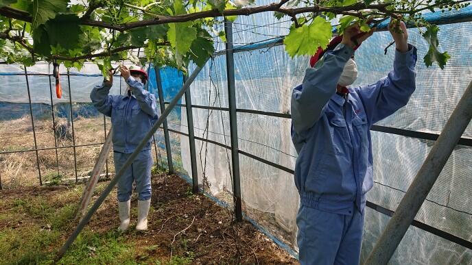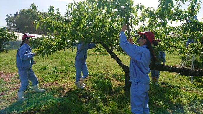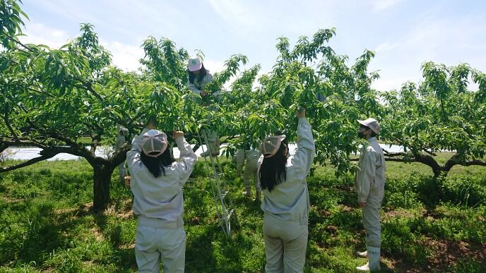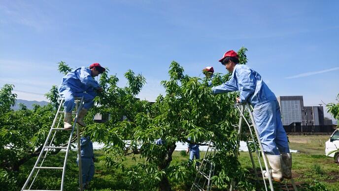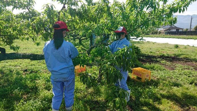 果樹園ではモモの摘果最盛期です。品質のよいモモを生産するには思い切った摘果が必要です。ゴールデンウイークも摘果に励みます。