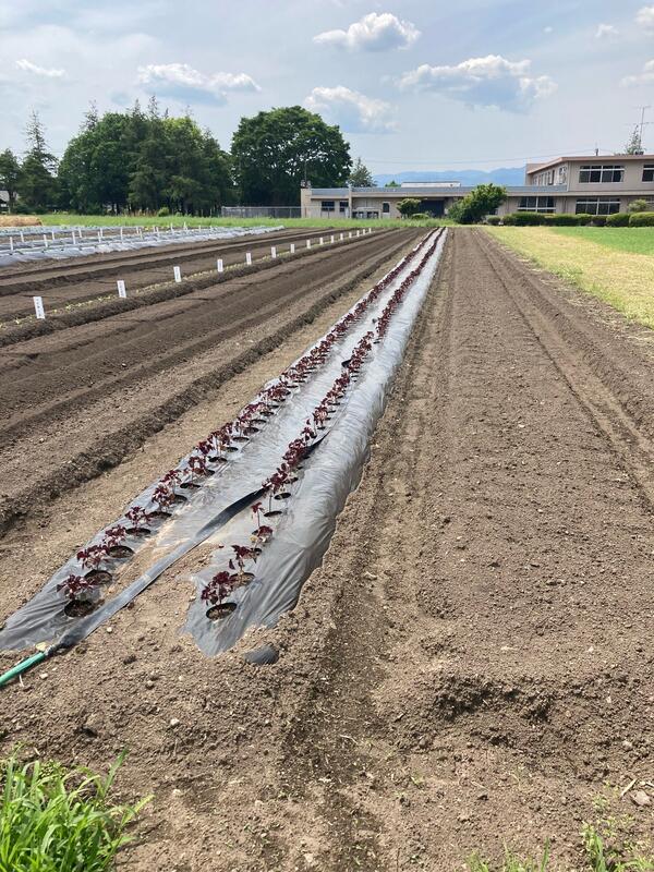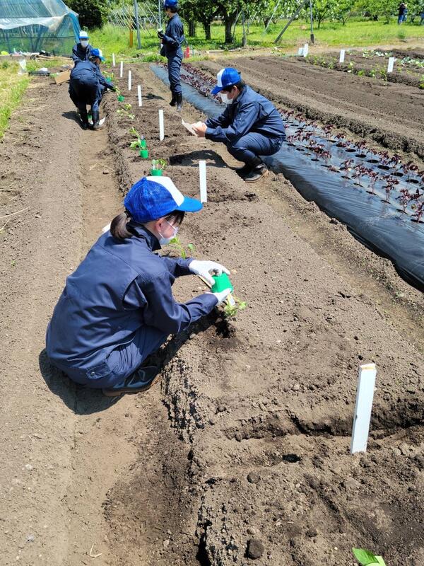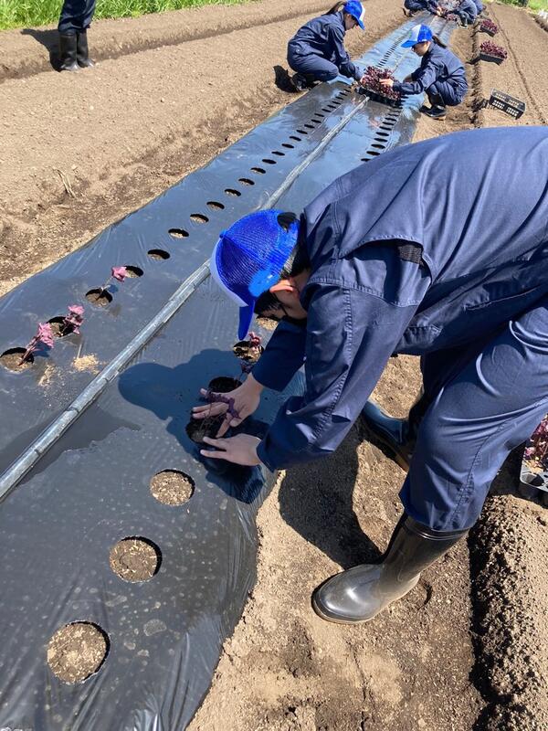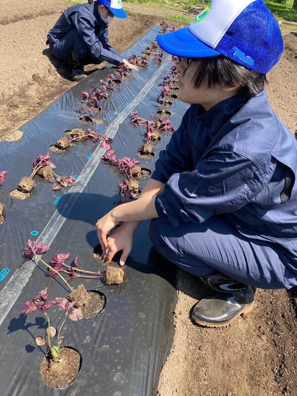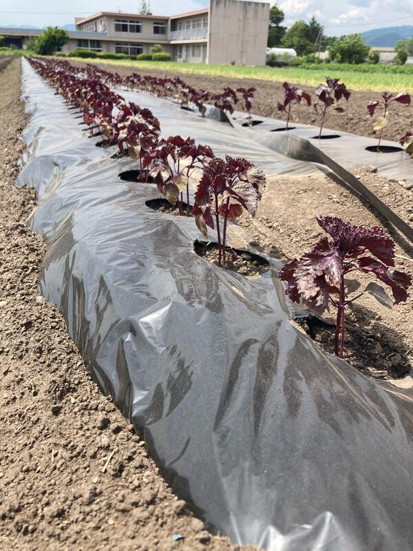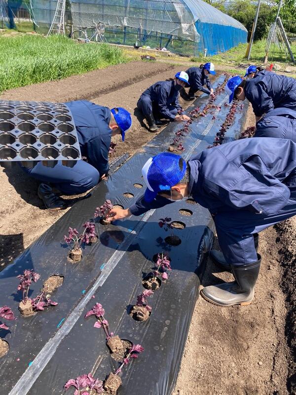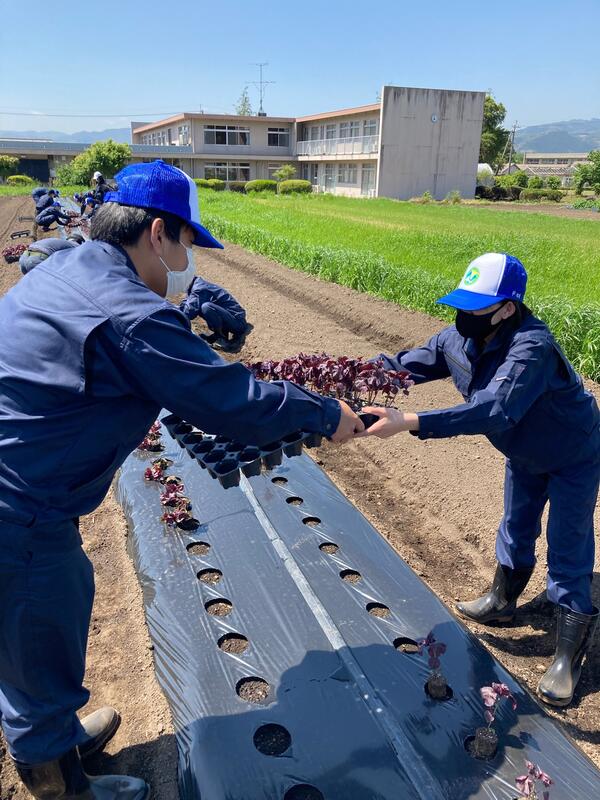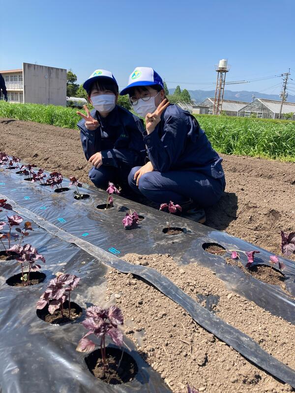 本日5限目に本校の実習製品である「シソジュース」と「KUMAの初恋」の原料となる、赤シソの定植を行いました。1年生がシソの定植、管理、収穫を行い2年生が「シソジュース」と「KUMAの初恋」を製造し瓶詰めします。