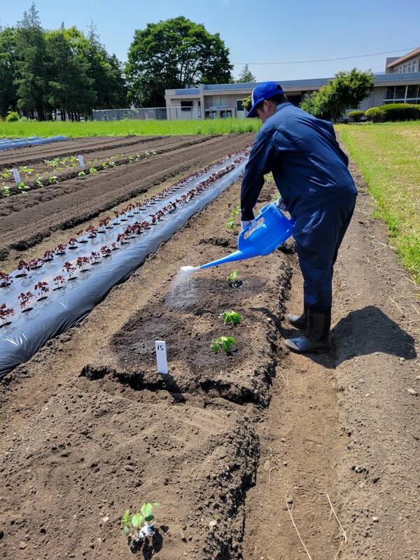 先日、種をまいた1年生活経営科の生徒。始業前に農場に来てかん水(みずやり)をしていました。芽が出るのが楽しみのようです。