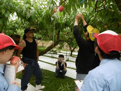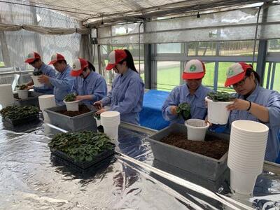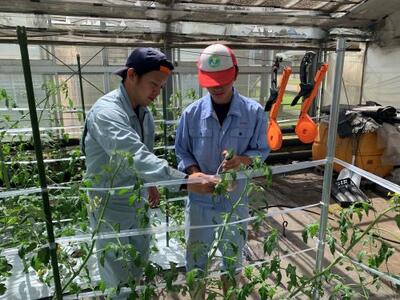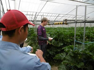 2年生の植物コースの実習風景です。中学生の皆さんは、特徴のあるこの葉の植物はわかりますか?これはスイカです。今日は、スイカの苗を垂直に伸ばすために、誘引しました。専用のテープを使いますが、無理をすると茎が折れてしまうので、注意が必要です。