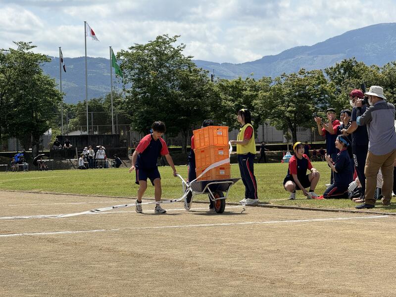 一輪車リレーは箱をゴールまで運びます。箱を落とさずに走るのがとても難しい!!崩れたら一輪車に積み直しです。がんばれー!!