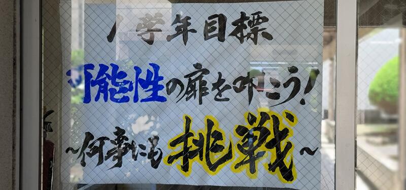 1学年の目標は「可能性の扉をたたこう~何事にも挑戦~」です。1年生の教室のある北棟・中央棟入口の「扉」に目標を掲げています。書道の土井先生が魂を込めて書いてくださいました