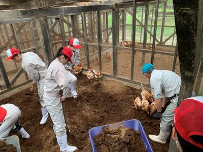 これは1年生の「小動物」の実習風景です。南稜高校では、養鶏でたくさんの鶏を飼育しています。今日は、鶏舎の鶏糞(けいふん)を集める実習でした。これによりニワトリたちは快適に過ごすことができます。そして、集めた鶏糞は、畑の肥料にします。これこそSDGsですね。