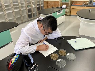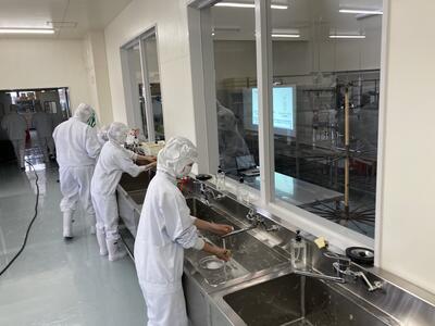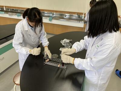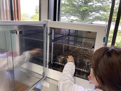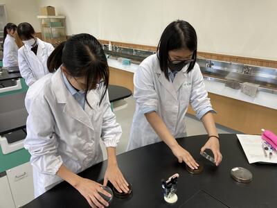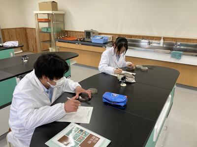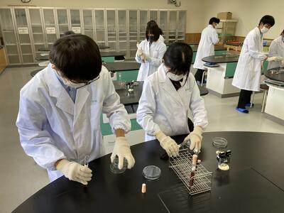 本日の実験では、先日作成した培地を使って手指に付着した微生物の採取を行いましたこれから販売用の飲料水やジャムの製造を行う2年生ですが、この実験を通して手洗い等の衛生管理の重要性を学びます