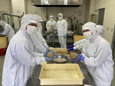 次に午前中に蒸した大豆とアメ(大豆の煮汁)を混合しソフトボール程の大きさにします。