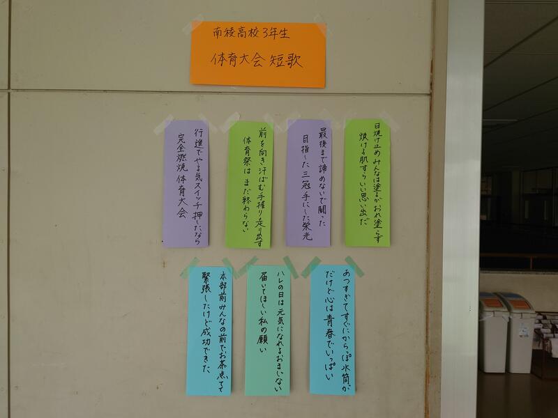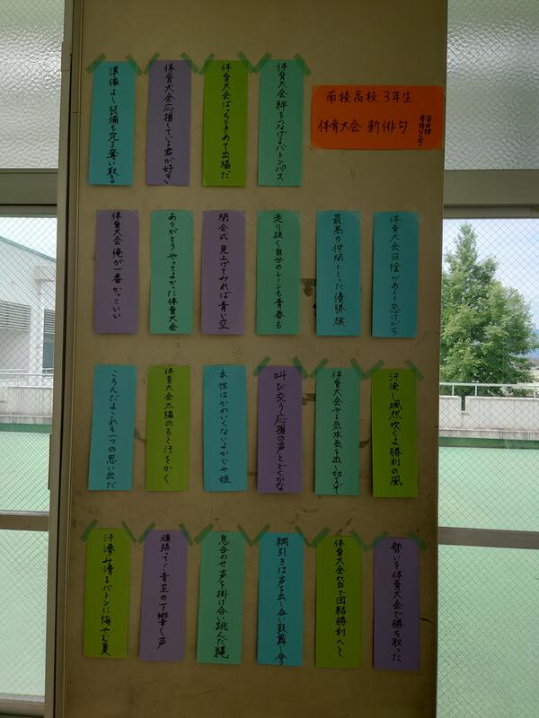 先日、授業の中で、「体育大会をテーマに短歌や俳句をつくってみませんか」と呼びかけたところ、たくさんの作品が集まりました。どれも力作です