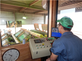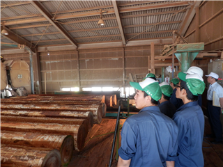 会社概要説明後に施設内を見学しました。大型の機械を操作し、丸太から製品にまるまでの