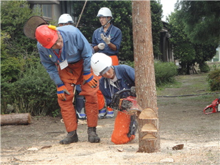 実技では、チェンソーを使って丸太の切断や伐木をしました。