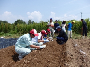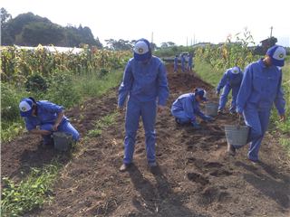 南稜就農塾、農家宿泊研修2日目。本日は4Hクラブの活動で相良村の畑にジャガイモの植え付けを行いました。