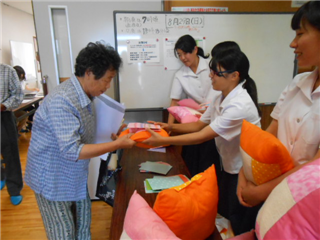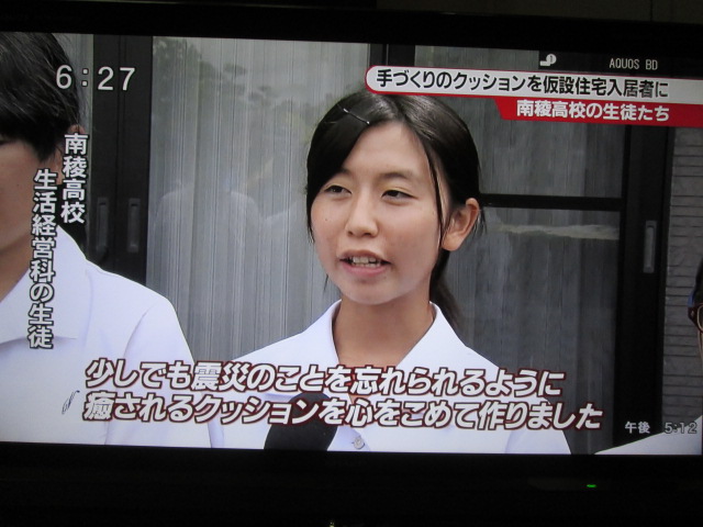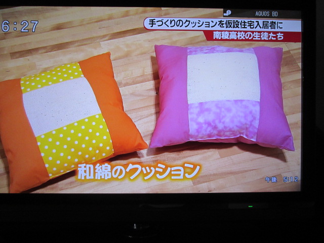 クッションは、和綿プロジェクト班を中心に生活経営科3年生が製作しました。5月から製作に取り組み、