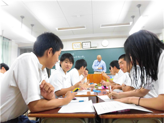 ☆分科会の様子 国際ビジネスカレッジ 大賀先生 休み時間、緊張している生徒と談笑。生徒の良さを